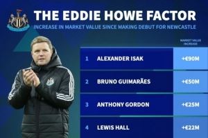 德转列加盟纽卡后升值榜:伊萨克暴涨9千万,吉马良斯、戈登在列