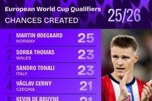 欧洲世预赛创造机会榜:厄德高25次居首,托纳利23次、丁丁21次