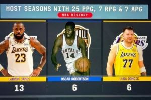 单赛季场均25+7+7场次:詹姆斯13次历史最多 东契奇大O历史第二