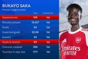 萨卡英超首秀以来出战199场、进54球、助攻45次,阿森纳队内居首